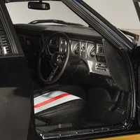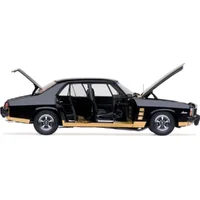 This 1/18 scale replica model is represented in the Tuxedo Black colour scheme. This sleek, deep black finish contributed to the vehicle's distinctive and bold appearance, enhancing its muscular design and complementing features like the refined grille and prominent GTS decals, including special "Gold-outs" instead of the standard "Black-outs" exclusive to the Tuxedo Black models. The HX series offered a range of vibrant colours, with Tuxedo Black standing out as a classic choice among enthusiasts.