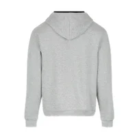 Two-coloured hoodie with double fabric, adjustable draw cord in contrast, reinforced covered seams in collar and kangaroo style pocket, 1x1 rib elastane in cuffs and waistband.